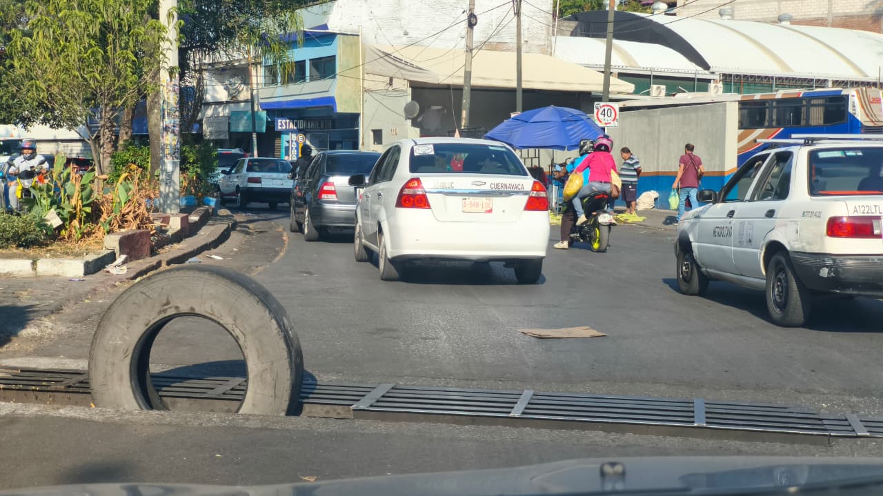 Una rejilla pluvial dañada se localiza en el circuito ALM, en Cuernavaca, señalizada con un neumático para evitar a conductores que sus vehículos caigan en ella; se recomienda precaución al transitar por la zona.