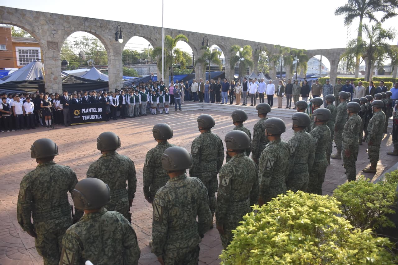 La gobernadora Margarita González Saravia encabezó este lunes la ceremonia de honores a la Bandera Nacional en la plaza cívica de Tehuixtla, en el municipio de Jojutla, junto con los titulares de los poderes Legislativo y Judicial.