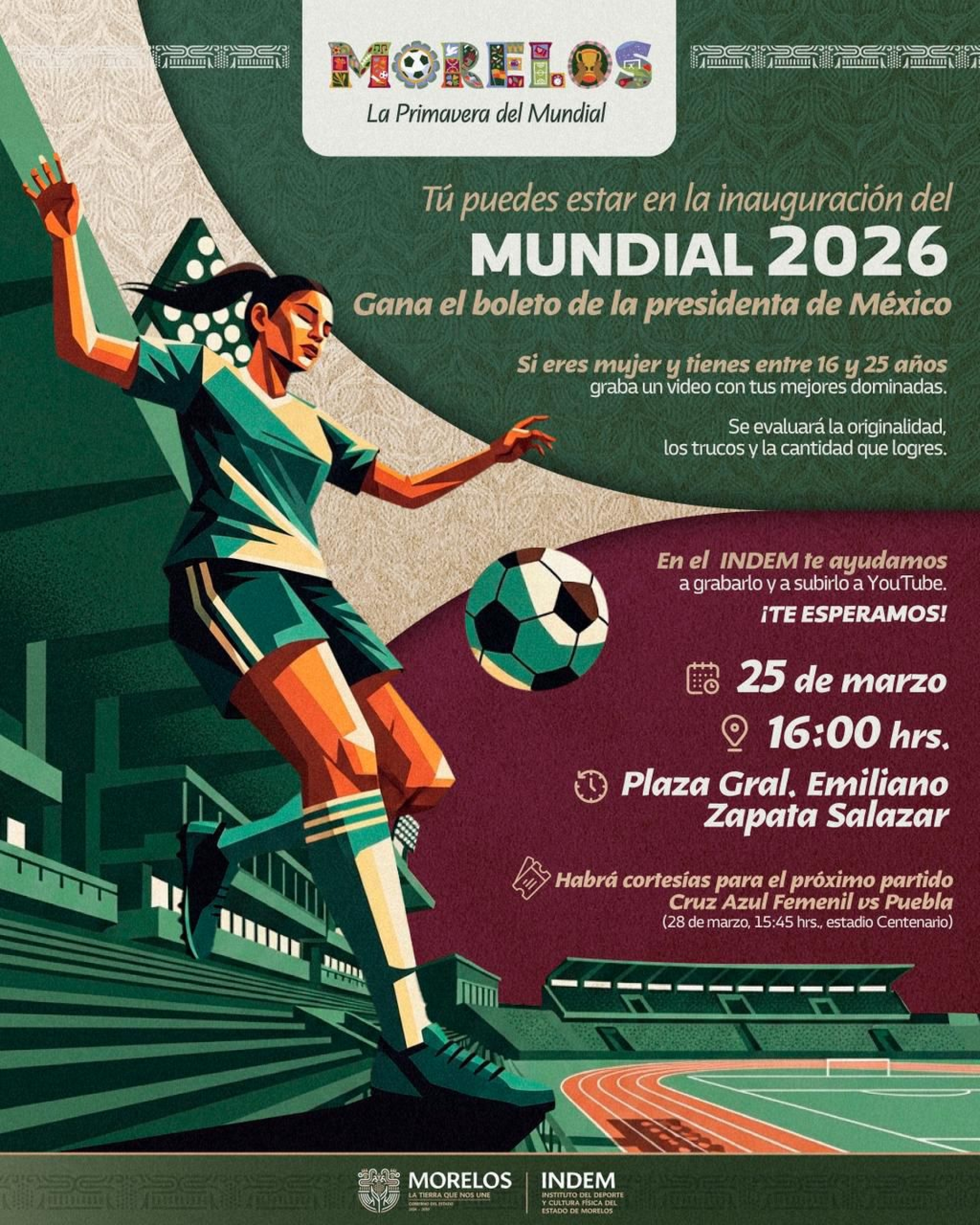 El Instituto del Deporte y Cultura Física del Estado de Morelos (Indem) invita a participar en la experiencia del "Reto de dominadas para mujeres rumbo al Mundial 2026", apoyando con la grabación.