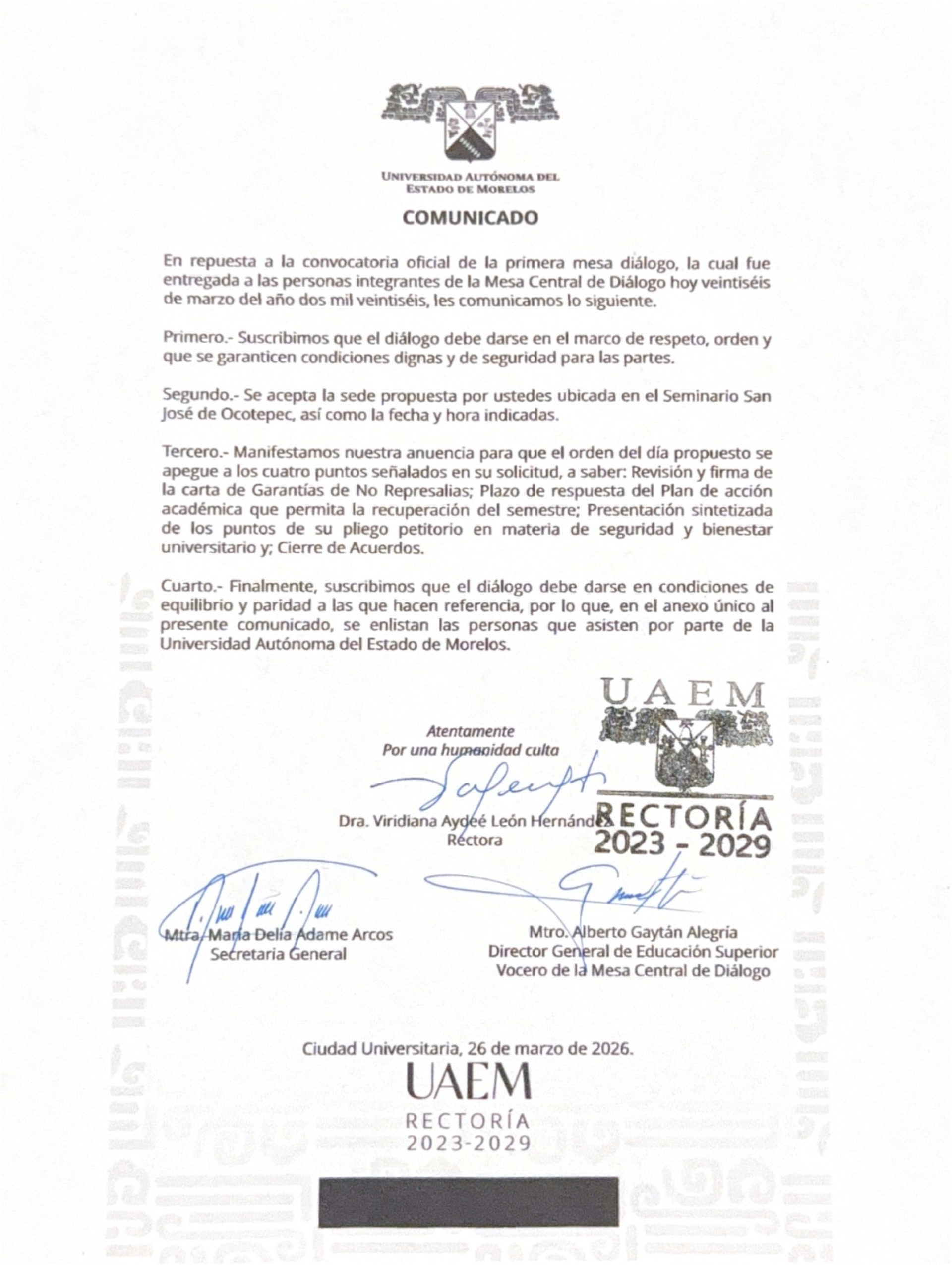 La Universidad Autónoma del Estado de Morelos (UAEM) anunció que acepta la sede del Seminario Mayor para entablar una mesa de diálogo con los estudiantes, este viernes, y firmar una carta de garantía de no represalias; se compromete la rectora, Viridiana León Hernández, a dialogar en condiciones de equilibrio y parcialidad.