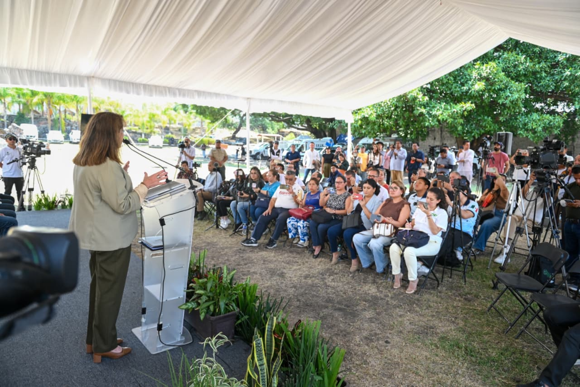 Previo a la conferencia, Margarita González Saravia, acompañada del presidente de la Mesa Directiva del Congreso local, Isaac Pimentel Mejía, y del presidente del Tribunal Superior de Justicia (TSJ), Juan Emilio Elizalde Figueroa, encabezó los honores a la bandera en la explanada de la ex Hacienda de Coahuixtla.