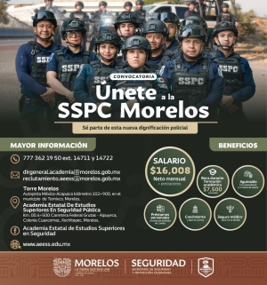 En continuidad con el fortalecimiento de la Estrategia Estatal de Seguridad Pública, que se encuentra alineada con la Estrategia Nacional de Seguridad Pública del Gobierno de México, la Secretaría de Seguridad y Protección Ciudadana (SSPC) Morelos mantiene abierta su Convocatoria 2026 “Únete a SSPC Morelos” para la contratación de más elementos policiales en este año.