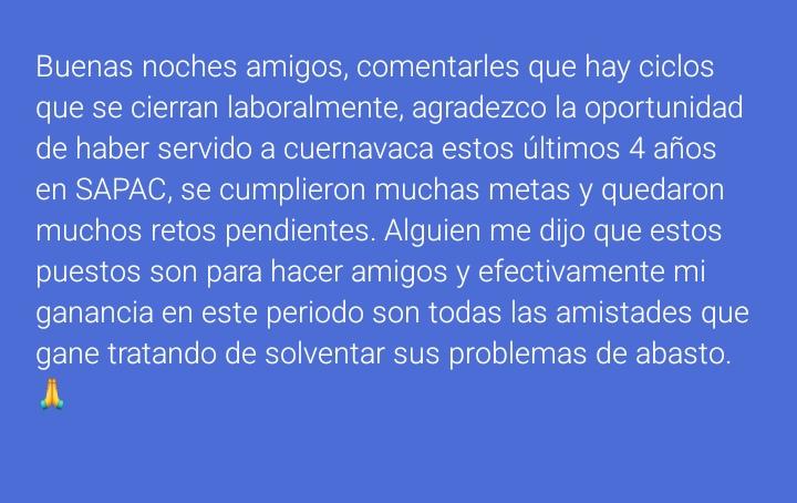 La tarde de este miércoles, Dante Figueroa Castelar, director operativo del Sistema de Agua Potable y Alcantarillado de Cuernavaca (SAPAC), mediante un mensaje en sus redes sociales, anunció que cierra un ciclo en el organismo operador de agua; destacó que tras cuatro años de trabajo se cumplieron las metas y quedan retos pendientes.