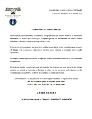 La Facultad de Derecho y Ciencias Sociales de la Universidad Autónoma del Estado de Morelos (UAEM) condenó enérgicamente la irrupción de personas ajenas a su comunidad en sus instalaciones, donde se registraron daños materiales y sustracciones.