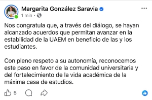 "Nos congratula que, a través del diálogo, se hayan alcanzado acuerdos que permitan avanzar en la estabilidad de la UAEM en beneficio de las y los estudiantes", anotó la mandataria estatal, a través de sus redes sociales.