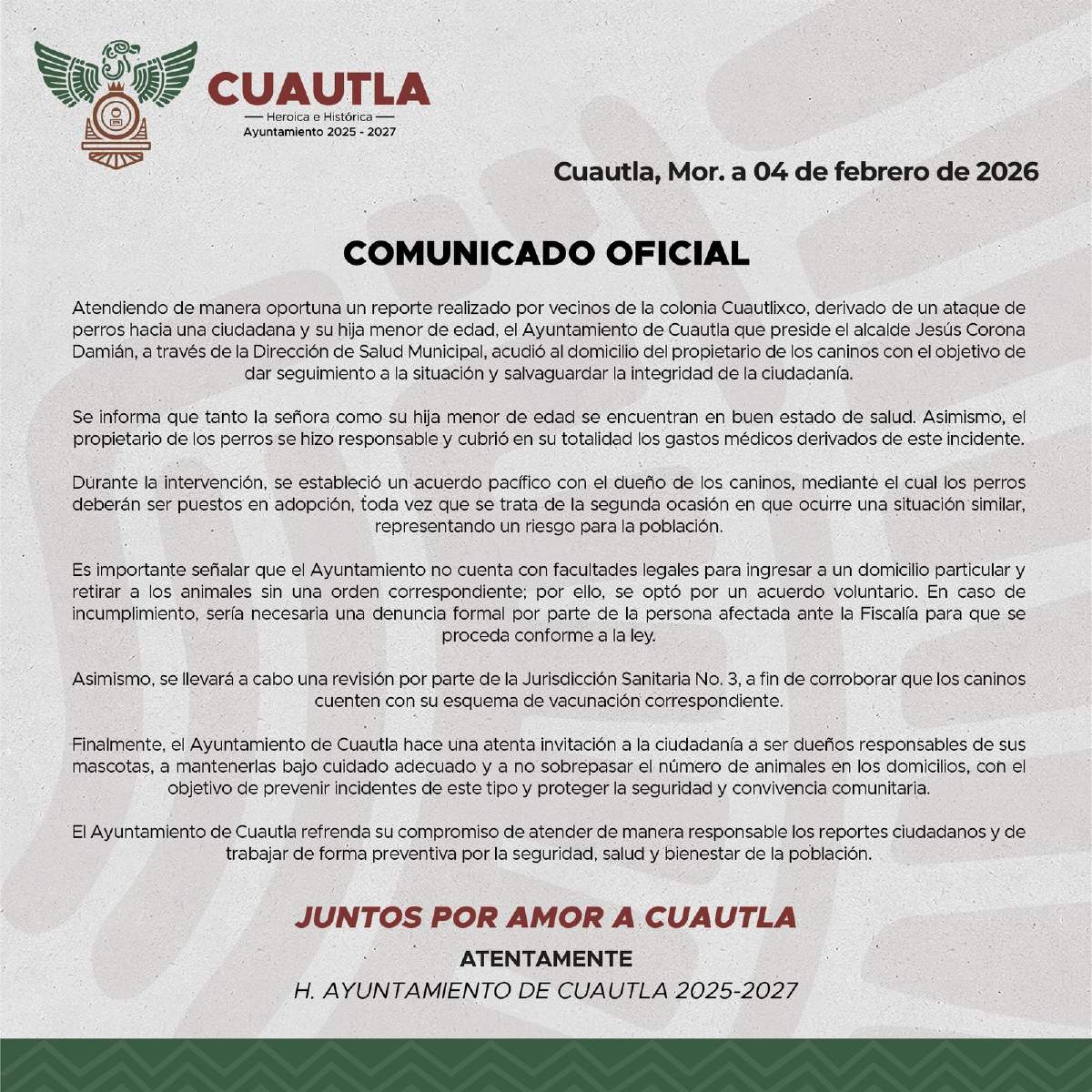 De acuerdo con el comunicado oficial, las víctimas –una mujer y su hija menor– se encuentran estables y el dueño de los animales accedió a cubrir la totalidad de los gastos médicos.