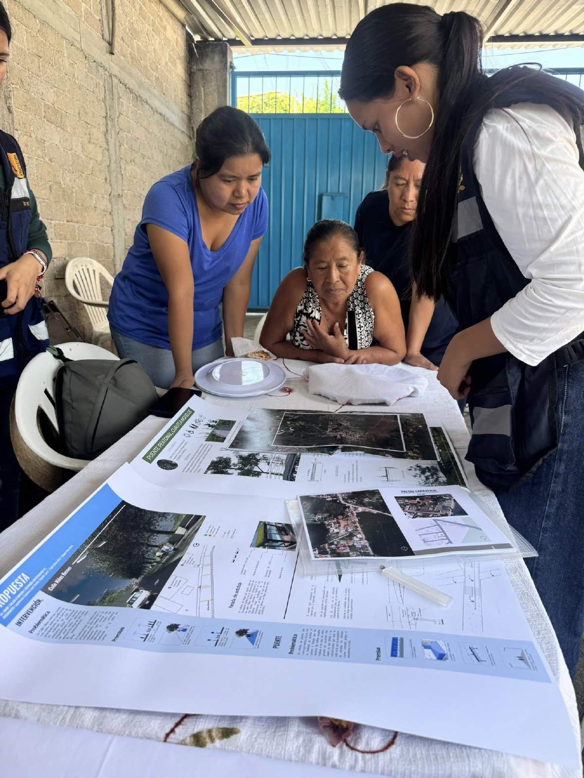 La delegación universitaria, acompañada por Astrid Cortés, sostuvo un encuentro directo con mujeres y residentes del poblado con el objetivo de presentar propuestas técnicas orientadas a la transformación y optimización de su entorno social y urbano.