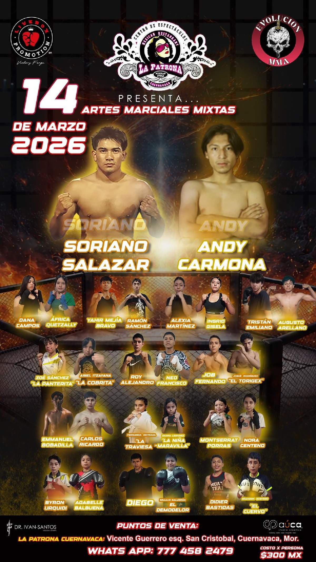 En el combate estelar, Fernando Soriano se enfrentará a Andy Carmona, "El Zombie", en MMA. "El Zombie" tiene 21 años y es de la colonia Antonio Barona, mientras que Fernando tiene 18 años.