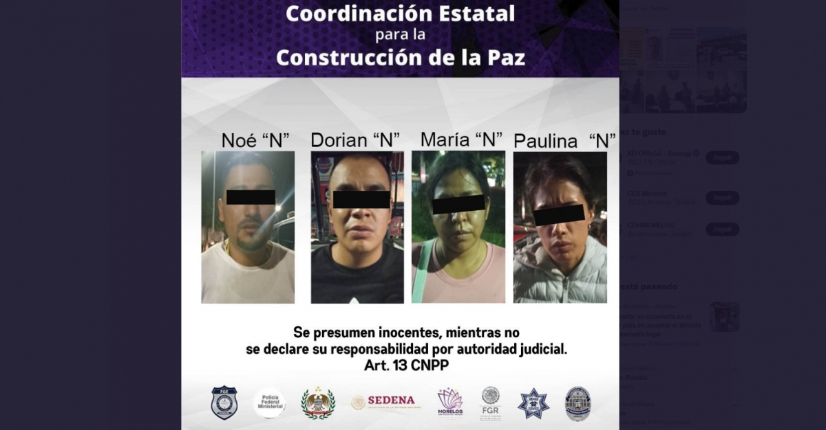 Por lo anterior y al no contar con el comprobante de compra, los policías arrestaron a quienes son identificados como Noé “N”, de 34 años de edad; Dorian Alexis “N”, de 28 años; María de los Ángeles “N”, de 37 años, y Paulina Lizbeth “N”, de 22 años, los cuales fueron puestos bajo la responsabilidad del Ministerio Público.