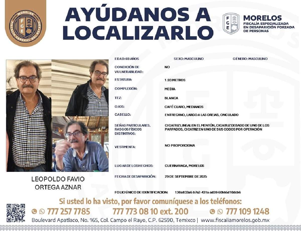 Con base en información de la ficha de búsqueda difundida por la Fiscalía General del Estado (FGE), se trata de quien es identificado como Leopoldo Favio Ortega Aznar, de 69 años de edad.