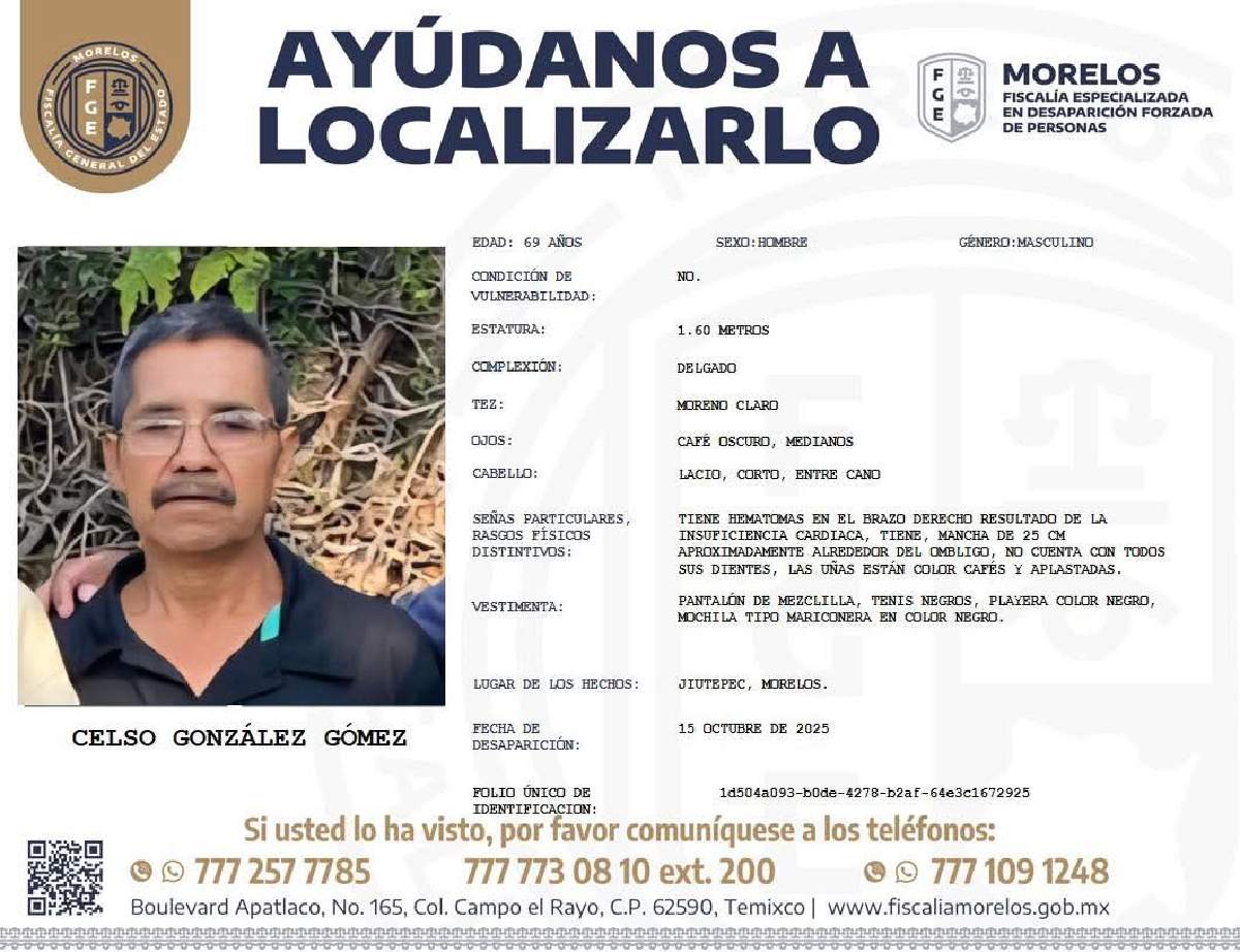 De acuerdo con información de la ficha de búsqueda difundida por la Fiscalía General del Estado (FGE) –a través de la Fiscalía Especializada en Desaparición Forzada de Personas–, se trata de quien es identificado como Celso González Gómez, de 69 años de edad, vecino del poblado de Atlacomulco.