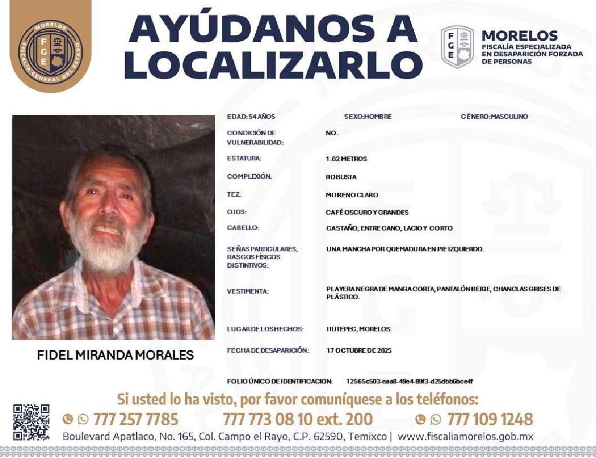 De acuerdo con información de la ficha de búsqueda que difundió la Fiscalía General del Estado (FGE), se trata de quien responde al nombre de Fidel Miranda Flores, de 54 años de edad.