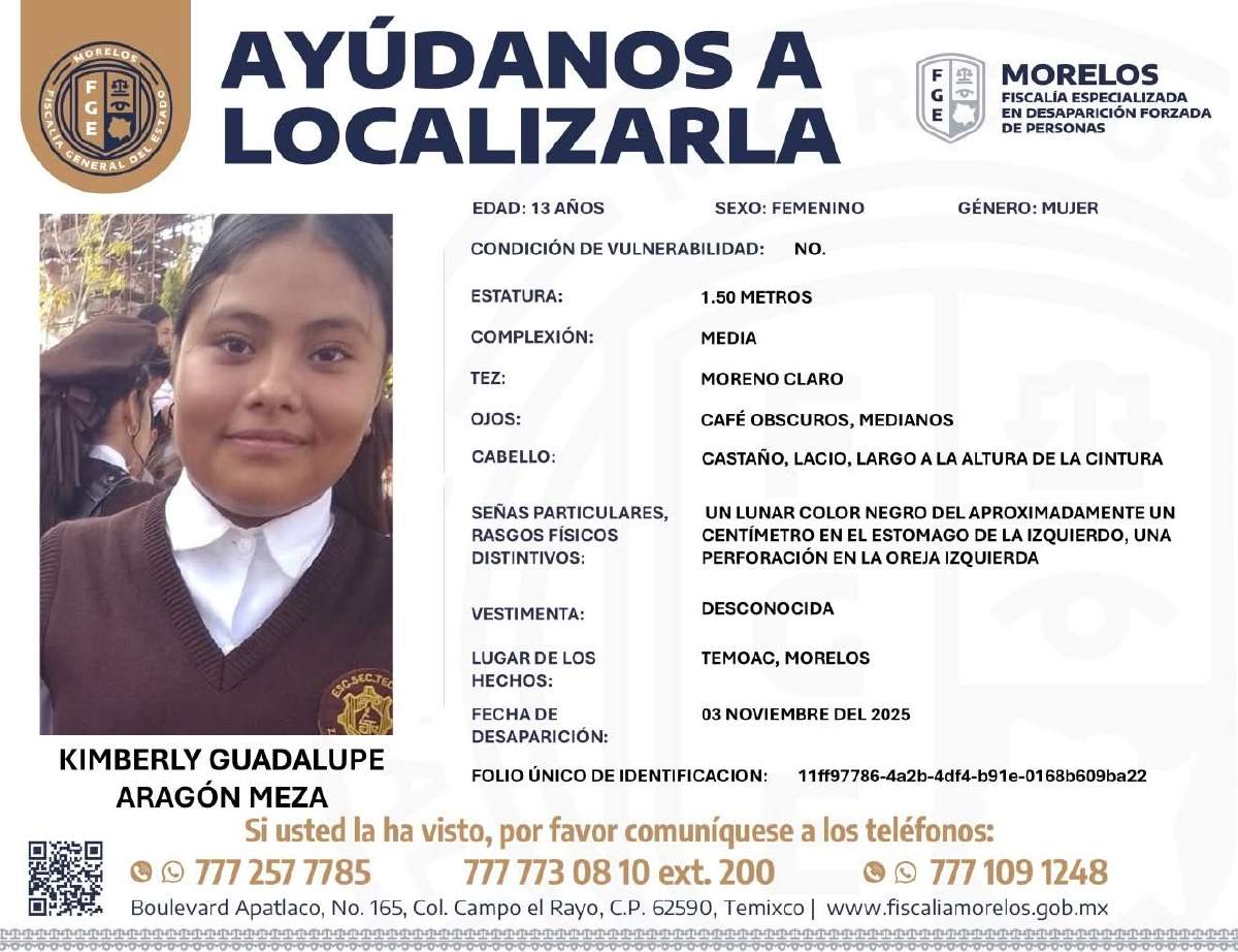 Con base en información de la ficha de búsqueda difundida por la Fiscalía General del Estado (FGE), se trata de quien es identificada como Kimberly Guadalupe Aragón Meza, de 13 años de edad.
