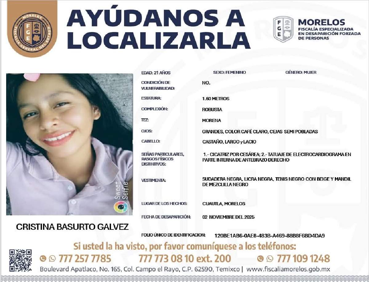 La Fiscalía General del Estado (FGE) informó –a través de una ficha de búsqueda– que se trata de quien es identificada como Cristina Basurto Gálvez, de 21 años de edad.