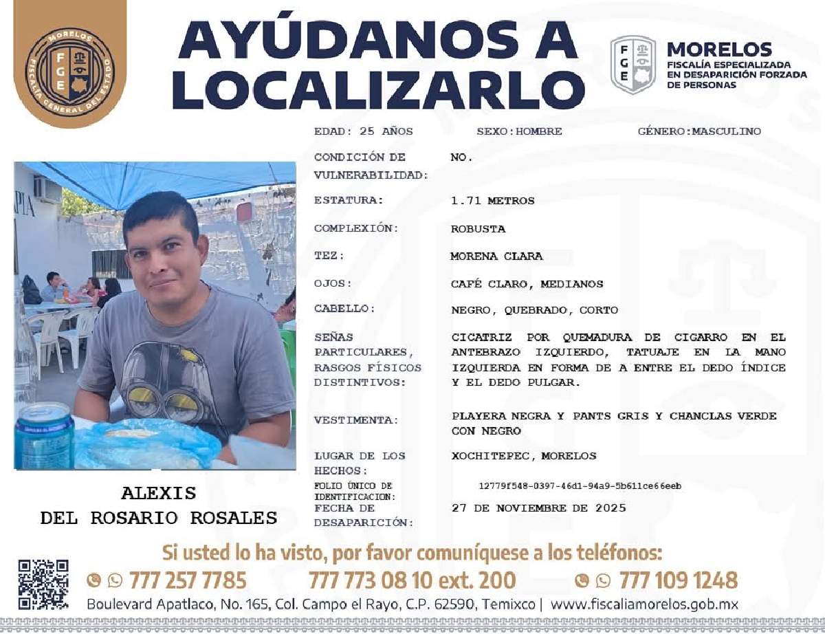 Asimismo, la FGE informó que el joven despareció el pasado jueves 27 de noviembre en el municipio de Xochitepec. En esa ocasión vestía playera negra y pants gris y calzaba chanclas de colores verde y negro.
