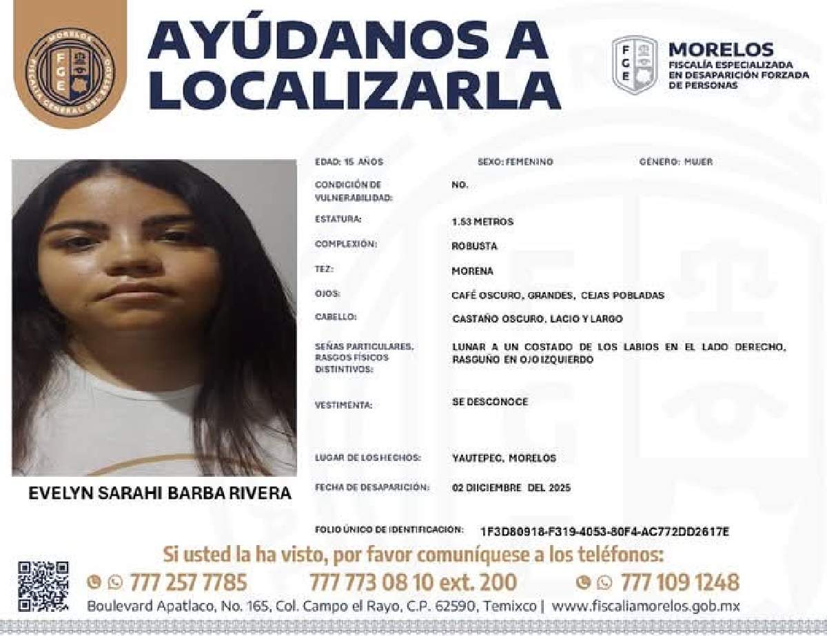 De acuerdo con información de la ficha de búsqueda que difundió la Fiscalía General del Estado (FGE) este miércoles, se trata de quien es identificada como Evelyn Sarahí Barba Rivera, de 15 años de edad.