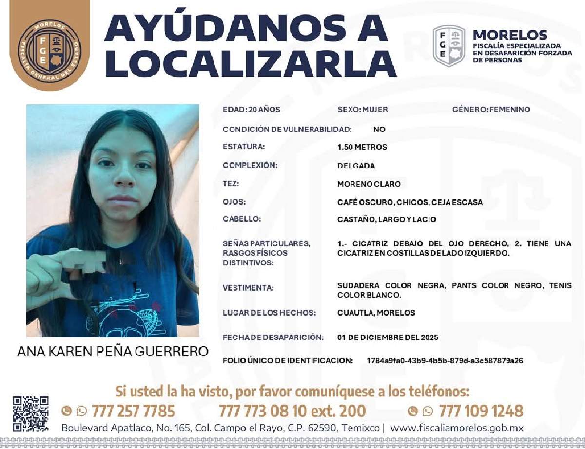 Al respecto, la Fiscalía General del Estado (FGE) informó –a través de una ficha de búsqueda difundida este jueves– que se trata de quien es identificada como Ana Karen Peña Guerrero, de 20 años de edad.