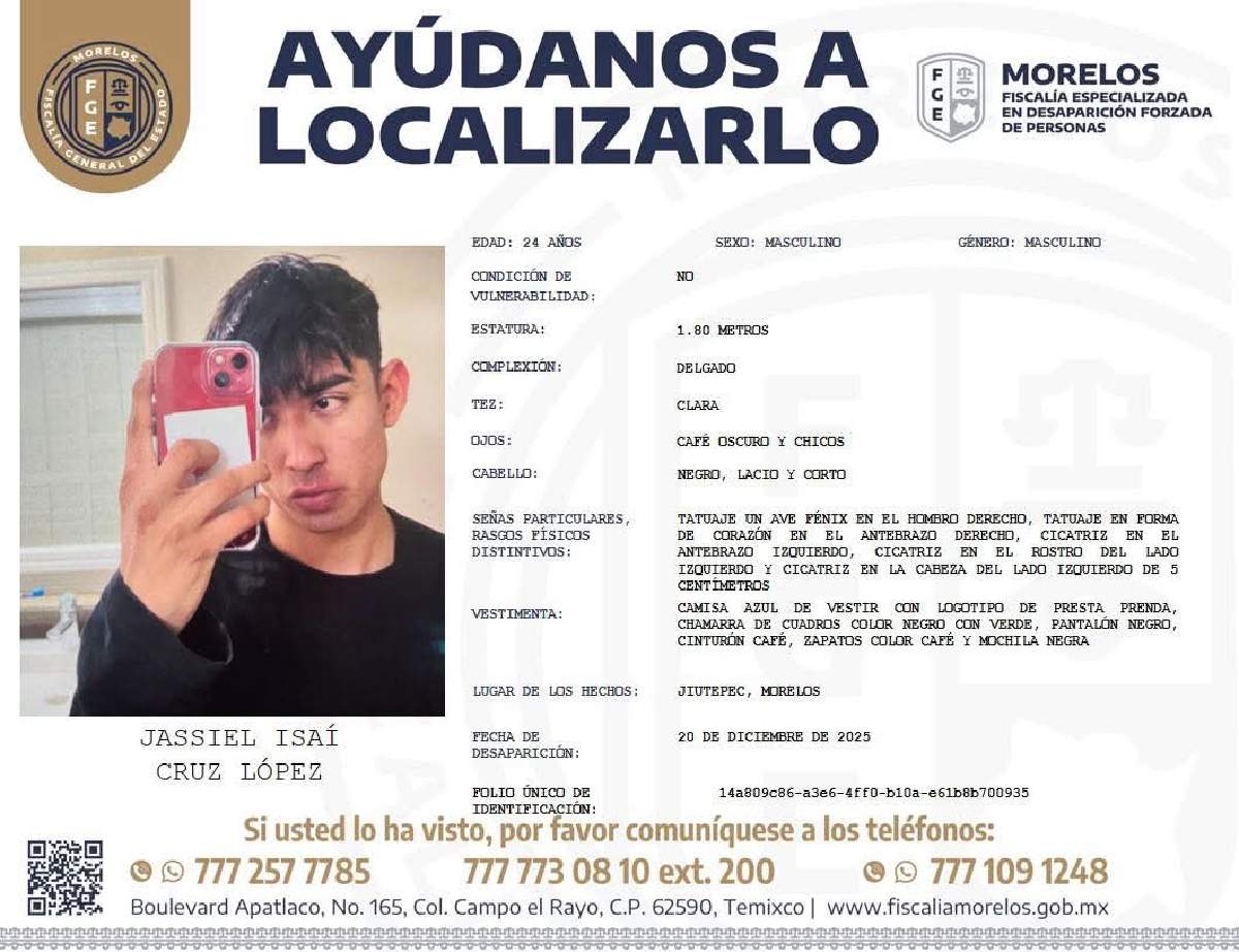 La FGE dio a conocer que el joven desapareció en el municipio de Jiutepec el pasado sábado 20 de diciembre.