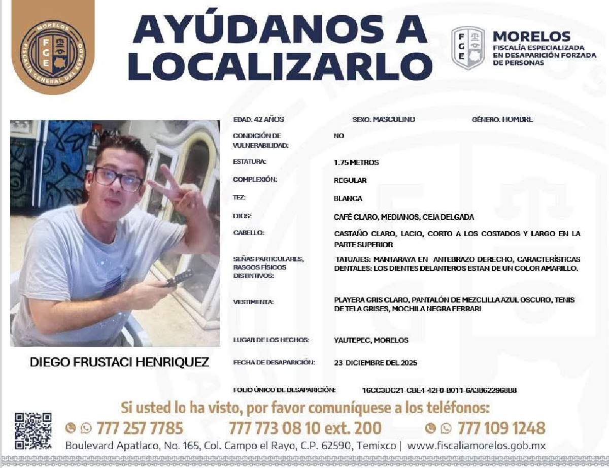 Al respecto, la Fiscalía General del Estado (FGE) informó –a través de una ficha de búsqueda– que se trata de quien es identificado como Diego Frustaci Henríquez, de 42 años de edad.