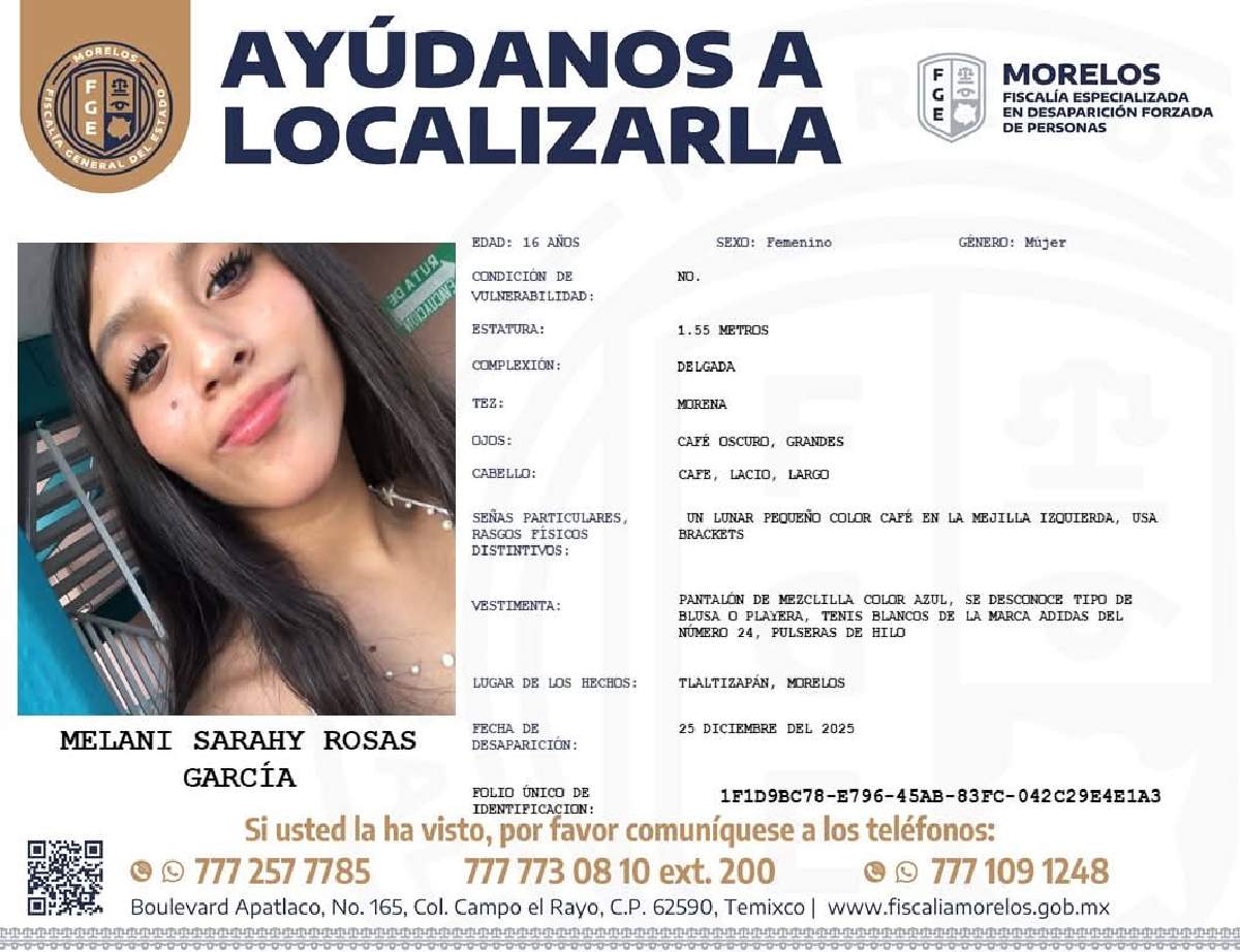 Asimismo, la FGE refirió que la adolescente desapareció el pasado jueves 25 de diciembre en el municipio de Tlaltizapán.