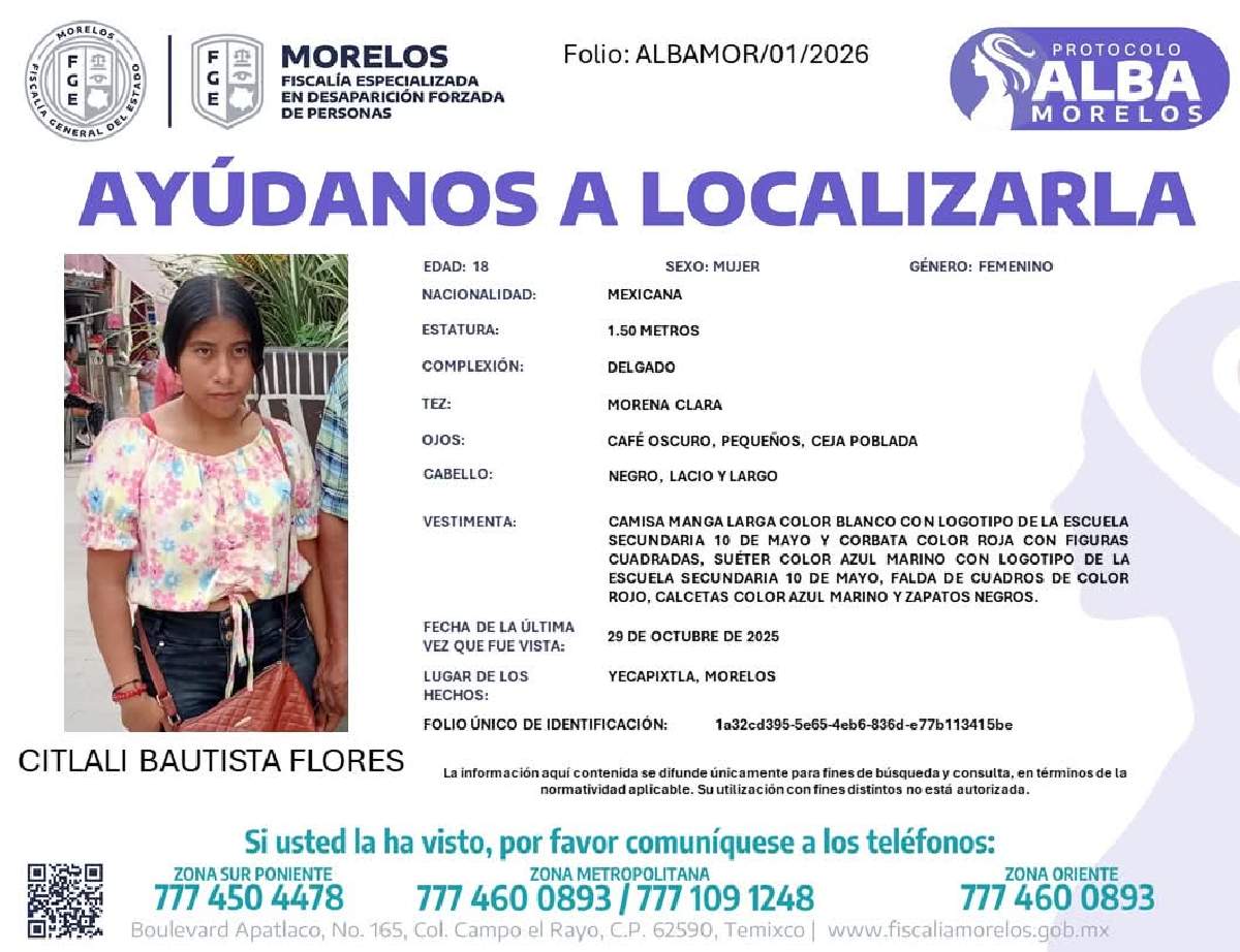 Se trata de una mujer de 18 años de edad que desapareció en el municipio de Yecapixtla el 29 de octubre de 2025.