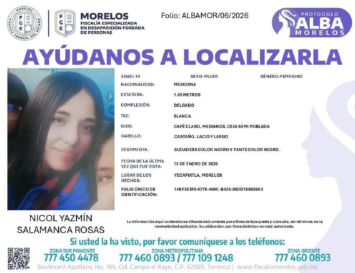 La Fiscalía General del Estado (FGE) informó –a través de una ficha de búsqueda– que se trata de quien es identificada como Nicol Yazmín Salamanca Rosas, de 14 años de edad.