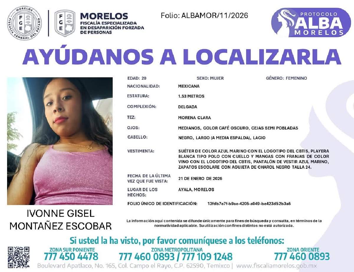 Asimismo, la FGE refirió que la mujer desapareció el pasado miércoles 21 de enero en el municipio de Ayala.