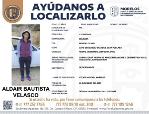 Con base en información de la ficha de búsqueda difundida por la Fiscalía General del Estado (FGE) este jueves, se trata de quien es identificado como Aldair Bautista Velasco, de 17 años de edad.