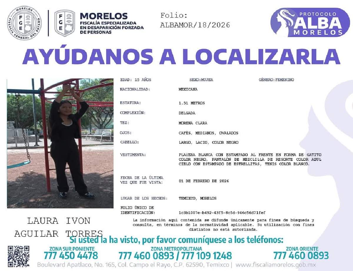 De acuerdo con información de la ficha de búsqueda difundida por la Fiscalía General del Estado (FGE), se trata de quien es identificada como Laura Ivón Aguilar Torres, de 15 años de edad.