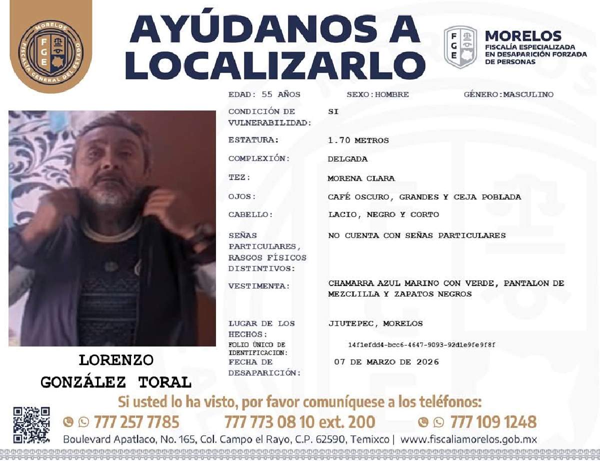 Asimismo, la FGE refirió que esta persona desapareció el pasado sábado 7 de marzo en el municipio de Jiutepec, por lo que difundió la ficha de búsqueda este domingo.