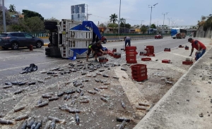 El vehículo, con capacidad de tres y media toneladas y cargado con refrescos, quedó recostado sobre un costado.