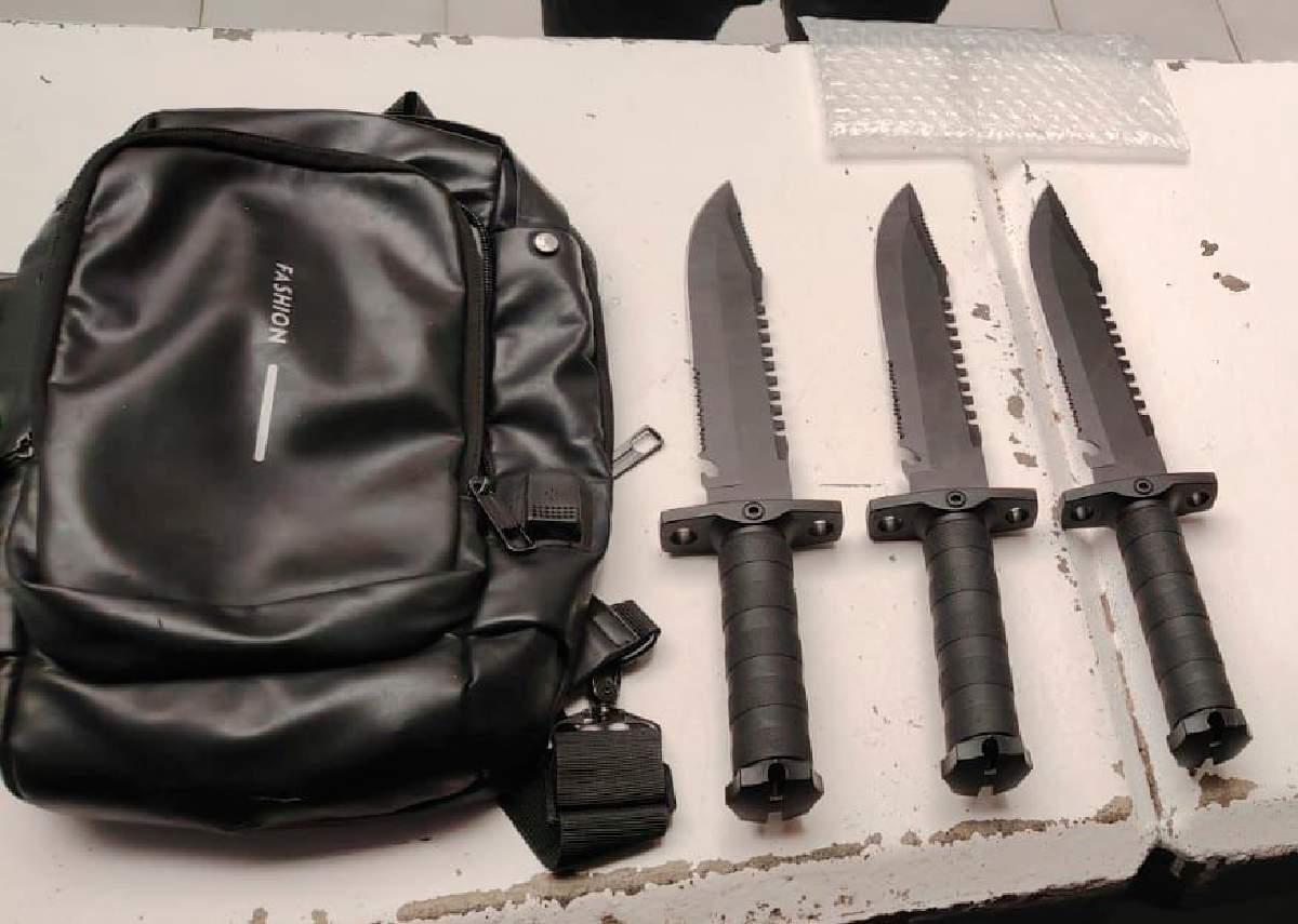 Asimismo, se informó que portaban tres cuchillos tácticos y dos botellas de bebidas alcohólicas.