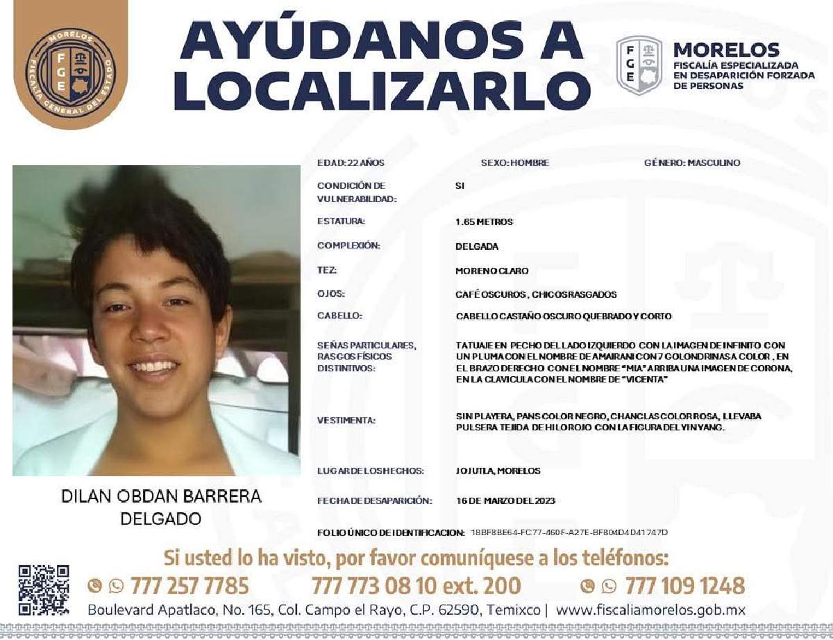 Con base en información de la ficha de búsqueda de la Fiscalía General del Estado (FGE), se trata de quien responde al nombre de Dilan Obdan Barrera Delgado, que tenía 18 años de edad en el momento de la desaparición.