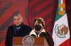 Delfina Gómez durante la conferencia mañanera encabezada por el secretario de Gobernación, Adán Augusto López.