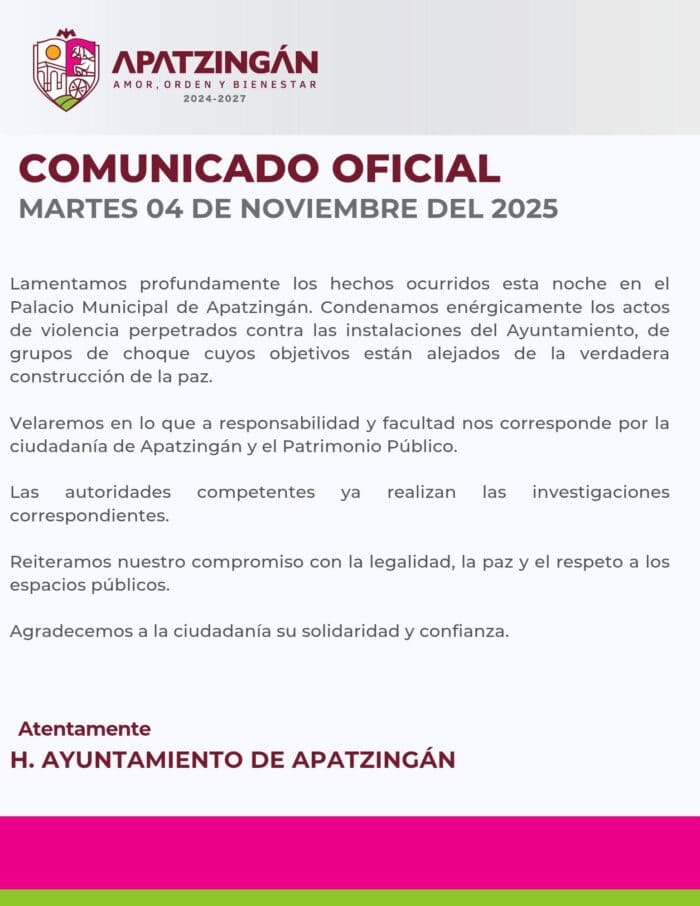 El Ayuntamiento condenó los hechos a través de un comunicado oficial, calificándolos como “actos de violencia perpetrados contra las instalaciones del Ayuntamiento, de grupos de choque cuyos objetivos están alejados de la verdadera construcción de la paz”.