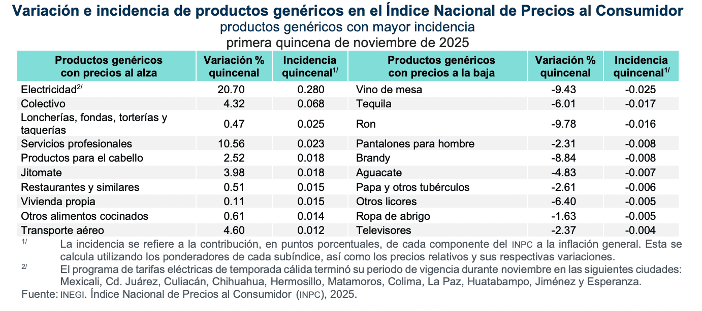 El Instituto Nacional de Estadística y Geografía (Inegi) informó que el Índice Nacional de Precios al Consumidor (INPC) aumentó 0.47 % durante la primera quincena de noviembre, lo que situó la inflación anual en 3.61 %, cifra inferior al 4.56 % registrado en el mismo periodo de 2024.