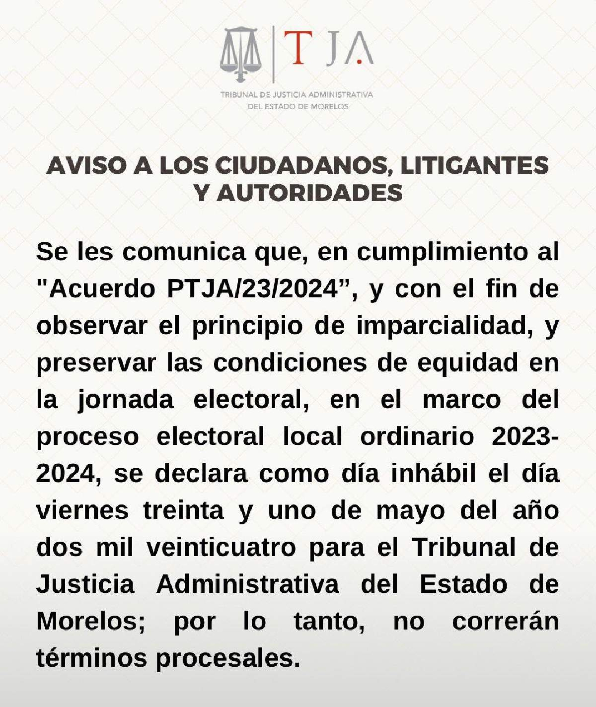"Acuerdo PTJA/23/2024. De conformidad con la parte considerativa del presente Acuerdo, y con el fin de observar el principio de imparcialidad, y preservar las condiciones de equidad en la jornada electoral, en el marco del proceso electoral local ordinario 2023-2024, se declara como día inhábil el día viernes treinta y uno de mayo del año dos mil veinticuatro para el Tribunal de Justicia Administrativa del Estado de Morelos; por lo tanto, no correrán términos procesales", cita el acuerdo.