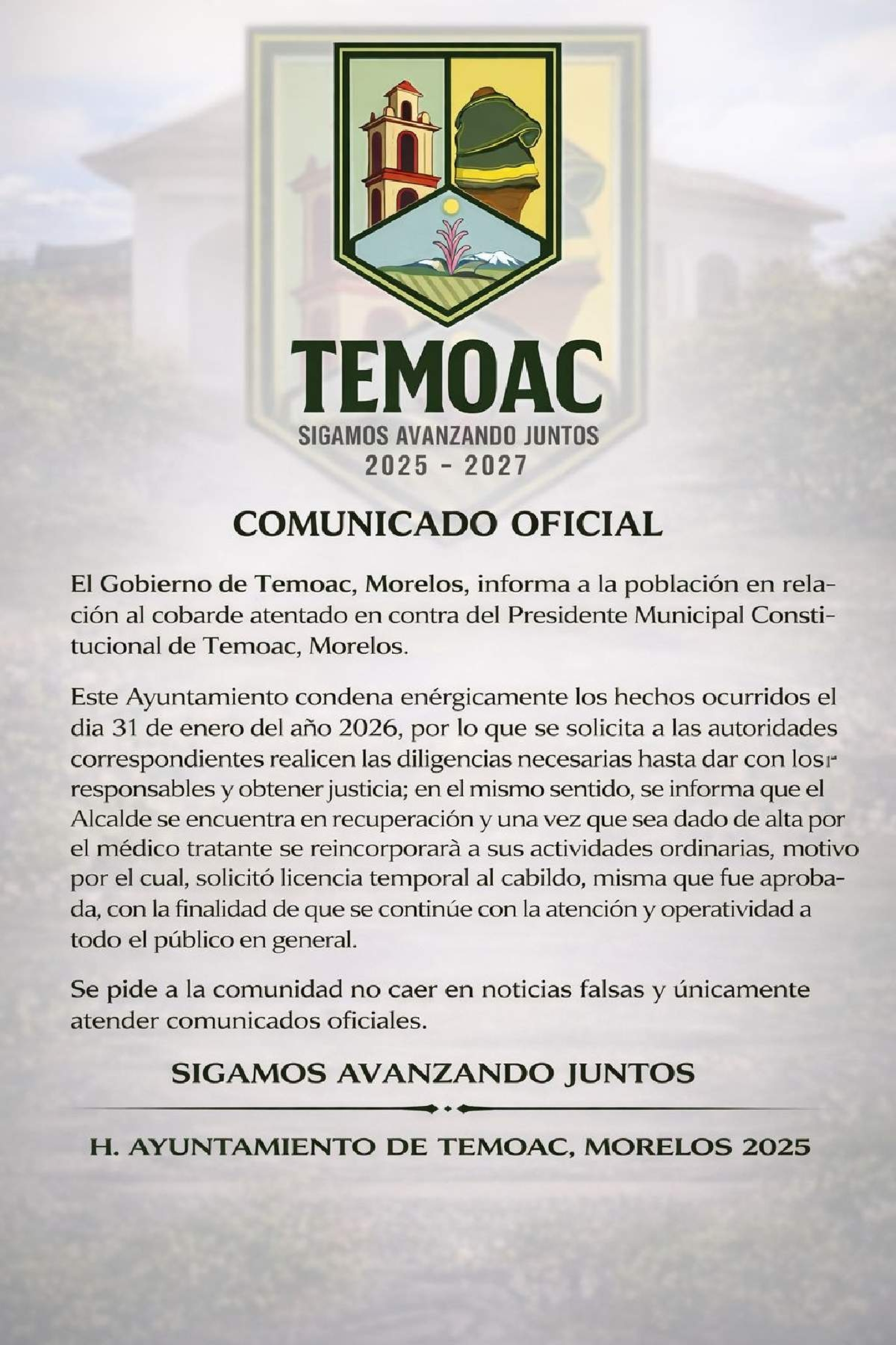 Por su parte, el gobierno de Temoac emitió un pronunciamiento en el que condena enérgicamente este "cobarde atentado" y exige a las instancias de justicia realizar las diligencias necesarias para dar con los responsables. El Ayuntamiento informó que el Cabildo aprobó de forma unánime la licencia del mandatario, garantizando así la operatividad de la administración pública y la atención ciudadana sin interrupciones durante su ausencia.