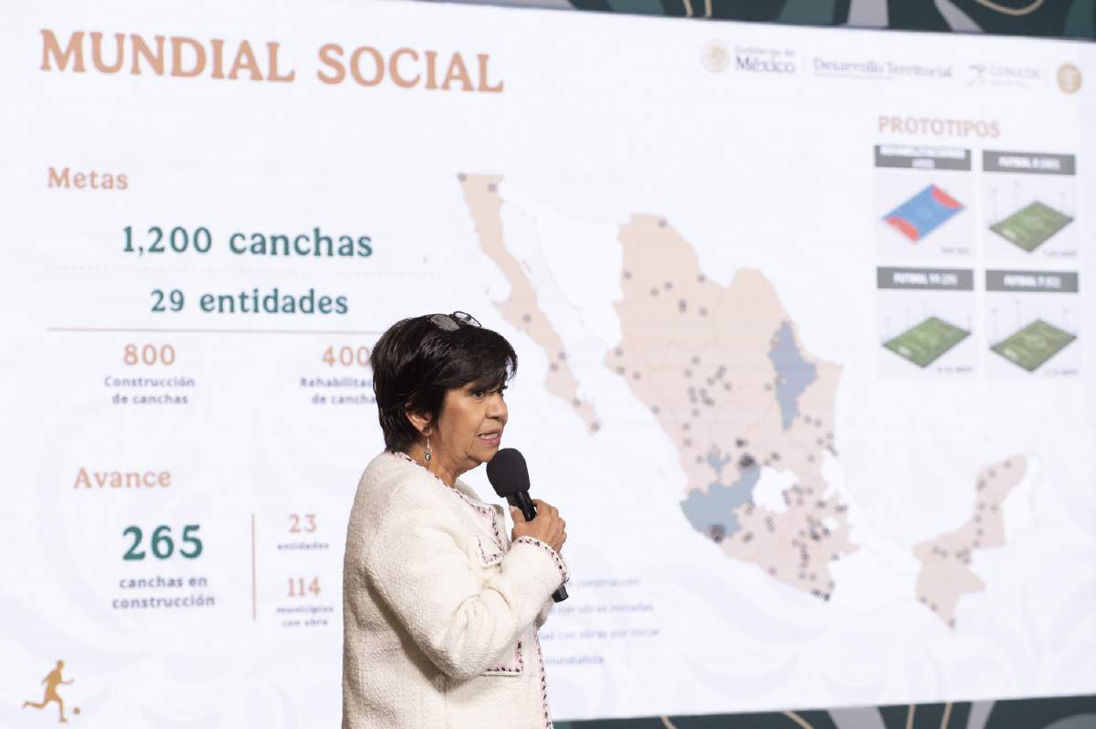 La secretaria de Desarrollo Agrario, Territorial y Urbano, Edna Elena Vega Rangel, informó que inició la construcción de las primeras 265 canchas en 114 municipios de 23 entidades de una meta de mil 200 canchas en 29 entidades: 800 que serán construidas y 400 rehabilitadas. Detalló que, para la segunda semana de marzo arrancan las obras en 270 canchas más y en la tercera semana de 265, además de que también inician los trabajos de rehabilitación en 400 canchas, esto con el objetivo de iniciar la entrega el 1 de mayo de 2026.
