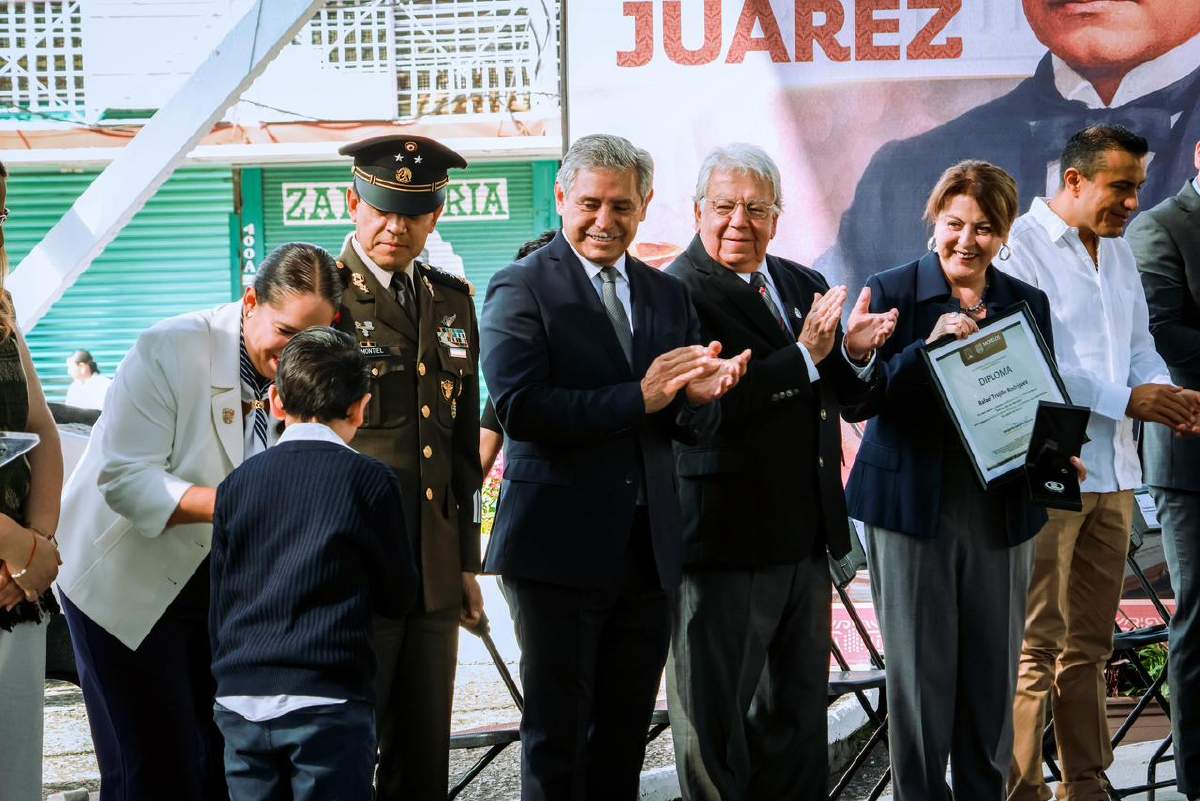 Durante la ceremonia, se llevó a cabo la entrega de la Medalla Benito Juárez García al Mérito Ciudadano, así como rosetas y diplomas a las y los ganadores del Concurso Estatal de Pintura “Juárez vive en Morelos”, reconociendo el talento y compromiso de estudiantes, docentes y personal administrativo de diversas instituciones educativas.