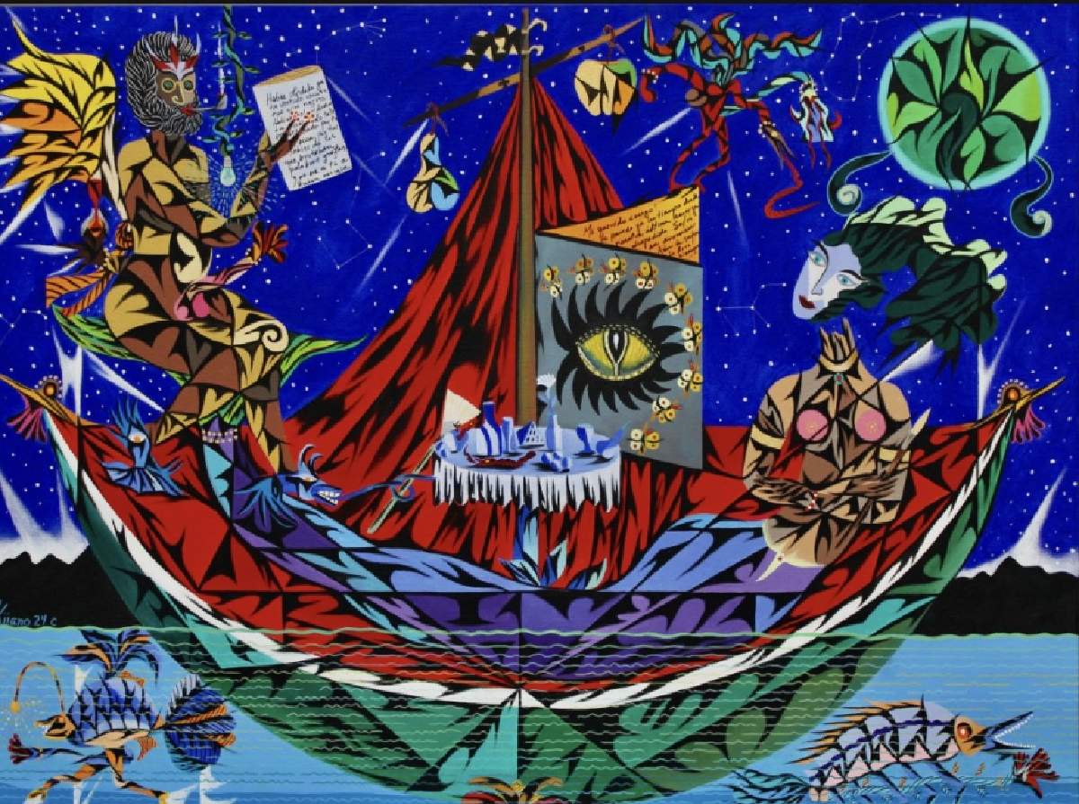 En cuanto a su discurso plástico, Kijano pinta en series temáticas hasta que considera que la ha agotado. Algunas series, como “El Color de mis Edades”, revelan emociones que van desde la infancia a la edad adulta. Series que poseen títulos sorprendentes como “De Sirenas, Diablos, Diablejos y uno que otro Zilicuije”, a la cual pertenece la obra que compartimos en este artículo, cuyo título es “Música de Sirenas a cargo del grupo de San Xarám”. Otra de sus series se refiere a las vivencias durante el tiempo de la epidemia de Covid: obras llenas de humor que nunca son burlas o críticas, sino parecen cargadas de ternura y comprensión.