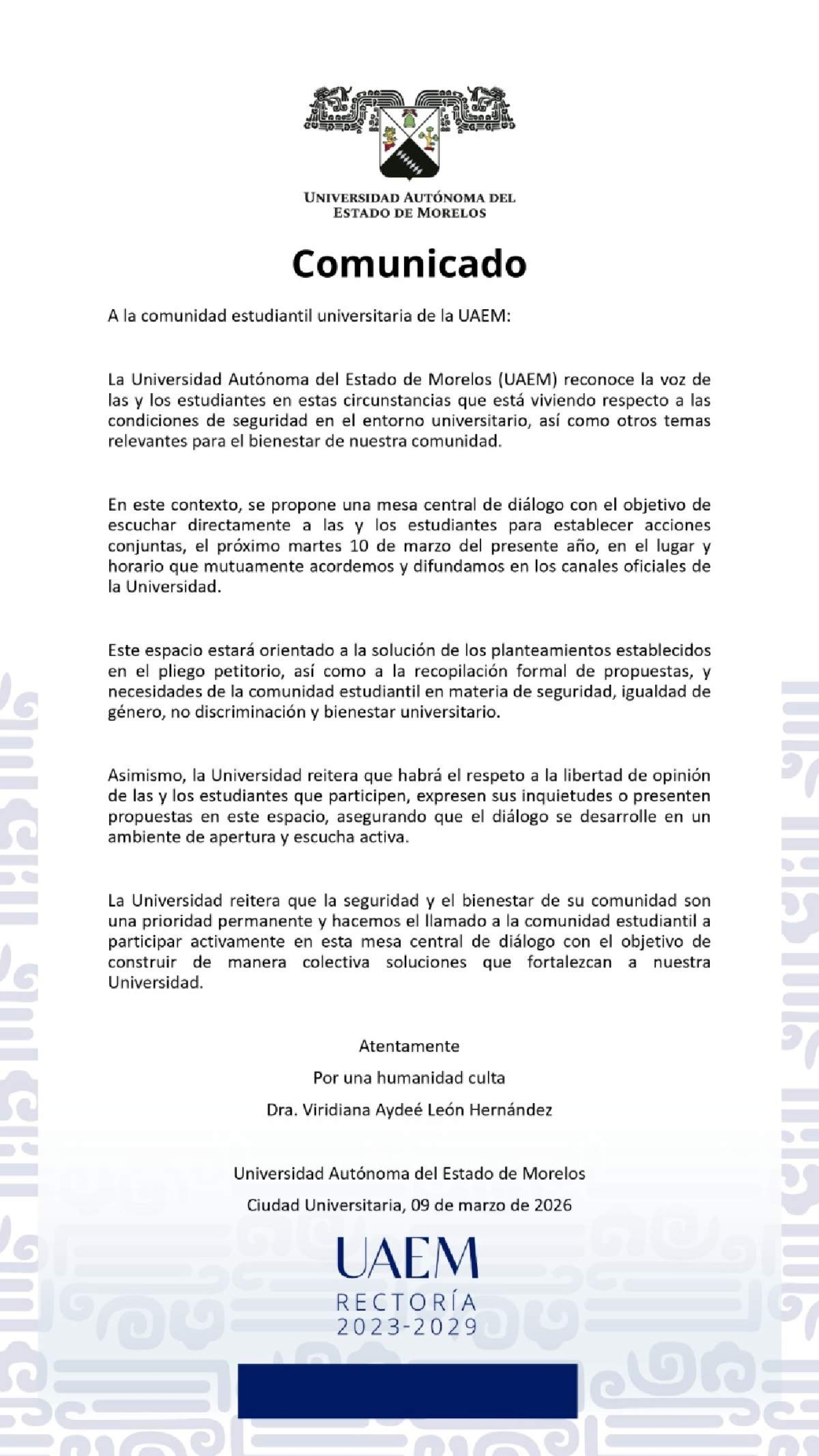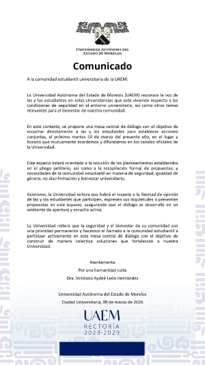 “Este documento será expuesto y entregado por sus representantes durante la mesa de trabajo del martes. Es importante destacar que estas conclusiones tendrán un carácter de propuesta oficial (no definitiva), ya que el objetivo es discutirlas e integrarlas en conjunto con los demás representantes para estructurar un plan de acción unificado que represente la voz y las demandas de la universidad”, indica el comunicado dirigido a la comunidad universitaria y firmado por la Resistencia Estudiantil UAEM.