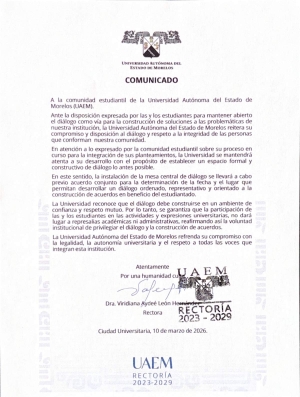 “Ante la disposición expresada por las y los estudiantes para mantener abierto el diálogo como vía para la construcción de soluciones a las problemáticas de nuestra institución, la Universidad Autónoma del Estado de Morelos reitera su compromiso y disposición al diálogo y respeto a la integridad de las personas que conforman nuestra comunidad”.