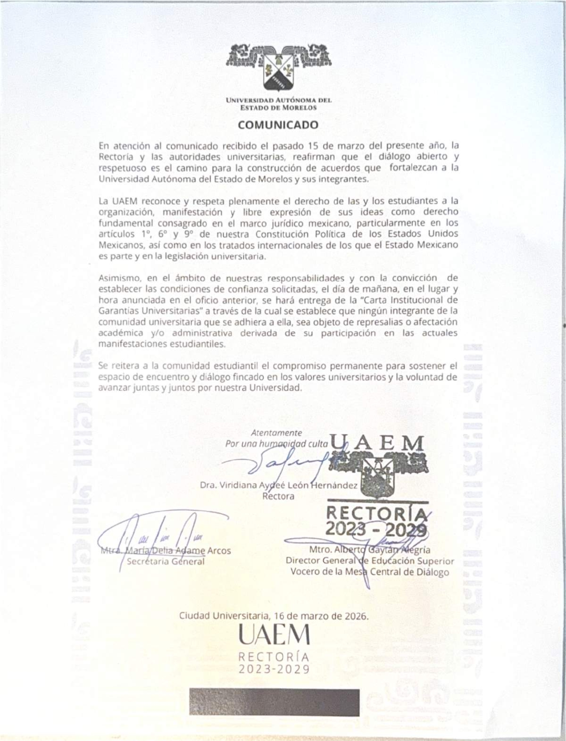 Informa que este martes, a las 11:00 horas, en el Polideportivo 1 del campus Chamilpa, como se propuso en un anterior oficio, se hará entrega de la “Carta Institucional de Garantías Universitarias”, en la que se establece que ningún integrante de la comunidad universitaria que se adhiera a ella será objeto de represalias o afectación académica y/o administrativa derivada de su participación en las actuales manifestaciones estudiantiles.