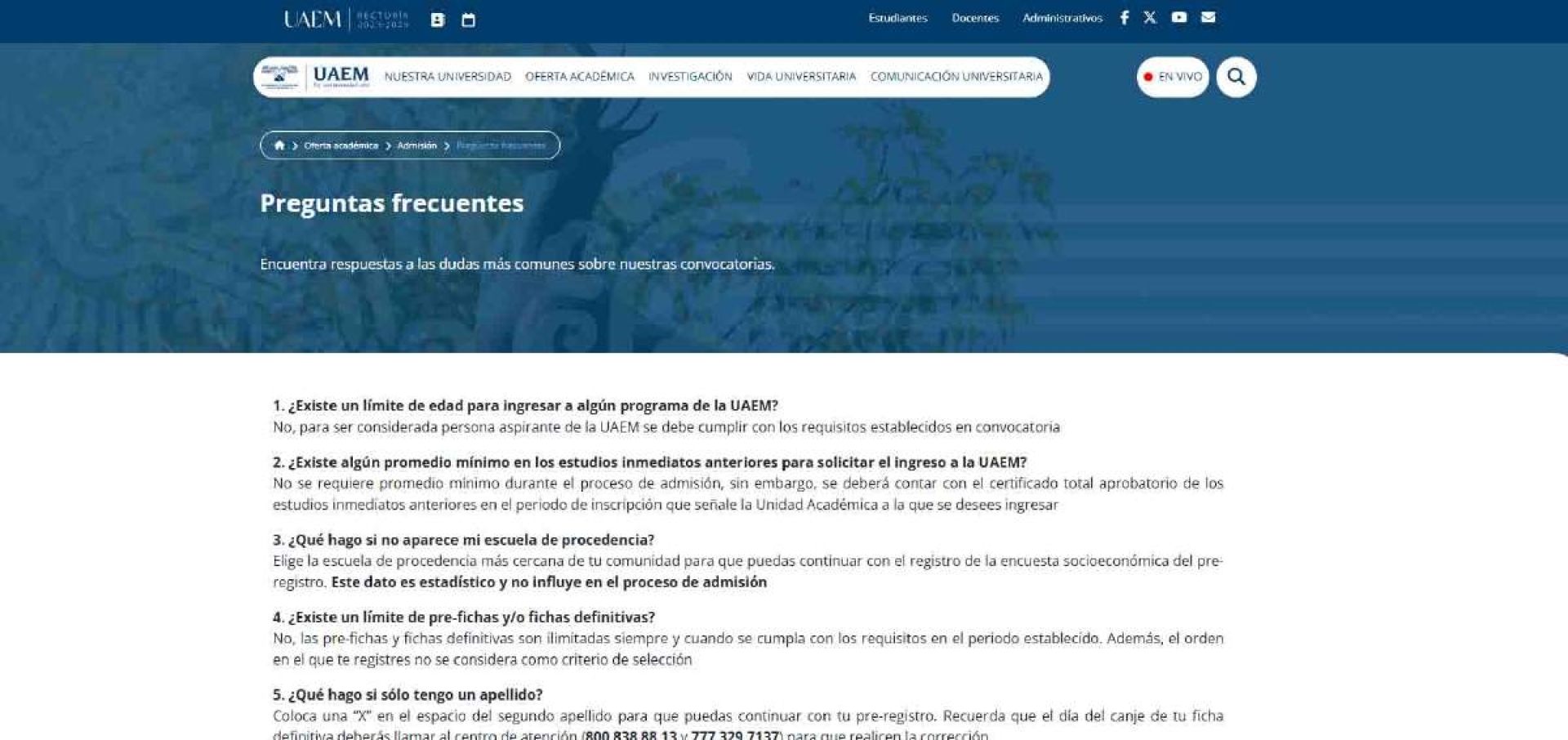 Cabe recordar que en la página electrónica institucional hay una sección de preguntas frecuentes para los aspirantes que requieran más información: https://www.uaem.mx/oferta-academica/admision/preguntas-frecuentes/.