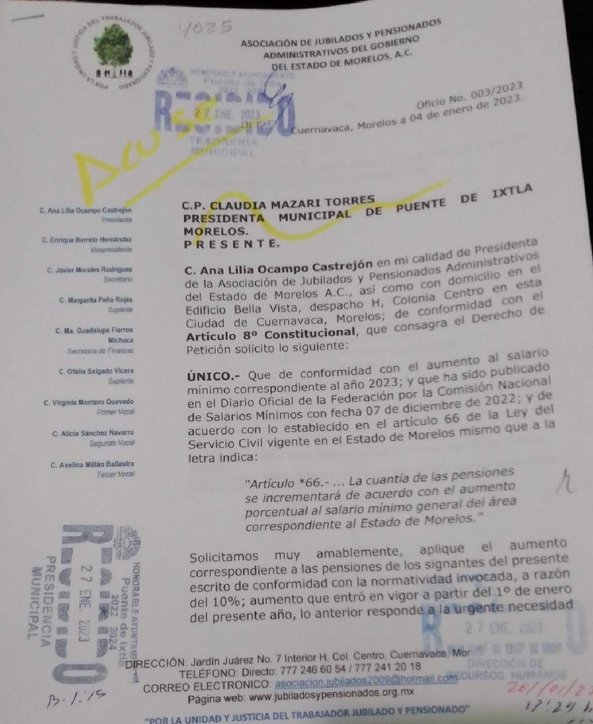 Puente de Ixtla.- Los trabajadores jubilados y pensionados del Ayuntamiento de este lugar están en espera de la mesa de negociación para aumento a sus percepciones de este año, por parte de la presidenta municipal, Claudia Mazari Torres.
