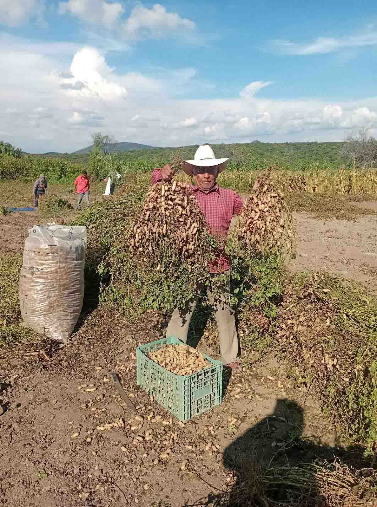 Las autoridades informaron que los campesinos comenzaron a levantar el fruto que sembraron con esfuerzo, utilizando una herramienta artesanal elaborada por ellos mismos a partir de una caja de plástico, con la cual desprenden el cacahuate de la mata; posteriormente lo colocan en costales de ixtle para su transporte.