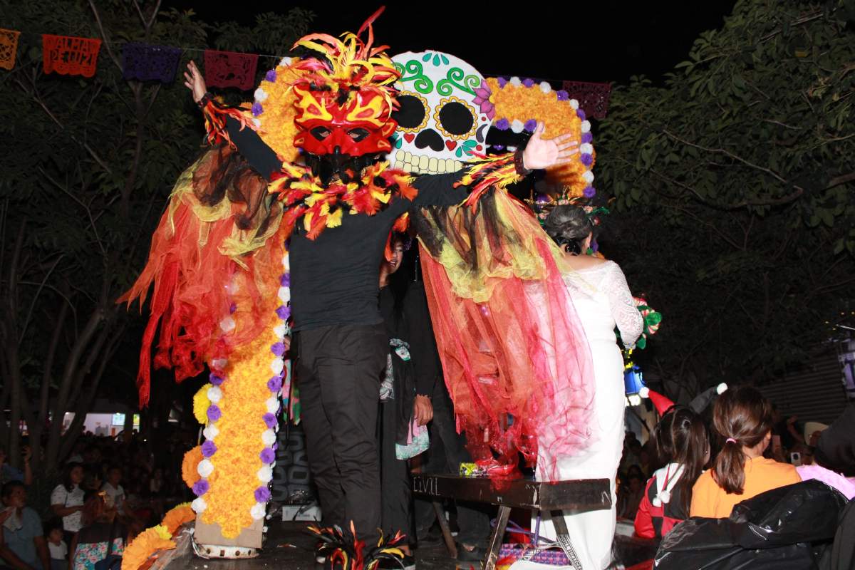 Durante el recorrido, los contingentes presentaron coreografías, disfraces tradicionales de catrinas elaborados con materiales reciclables, atuendos de guerreros aztecas, payasos diabólicos y otras representaciones alusivas a la festividad.