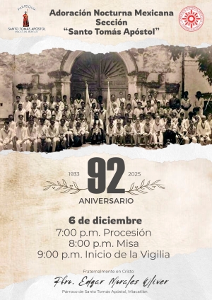 Miacatlán.- La comunidad católica de este municipio se prepara para celebrar el 92 aniversario de la Sección Adoradora Nocturna Mexicana, una tradición de arraigo y participación comunitaria.