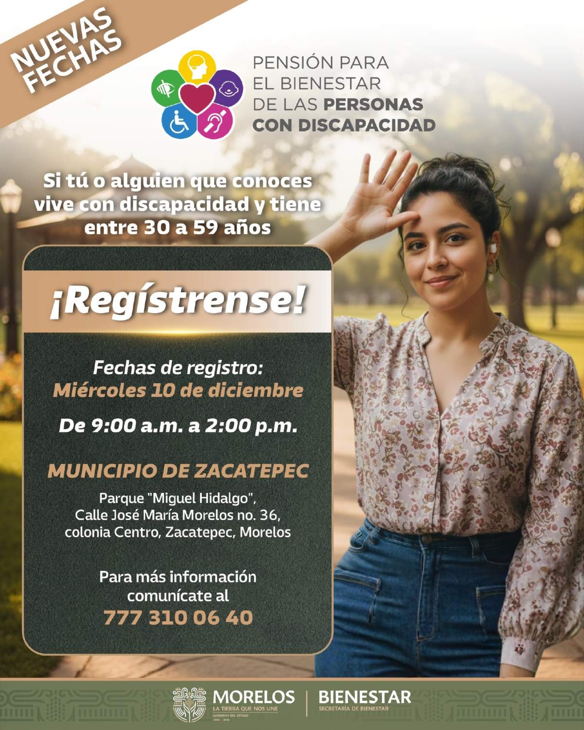 Zacatepec.- Este miércoles 10 de diciembre, personal de la Secretaría de Bienestar estatal instalará un módulo para el registro al Programa Pensión para el Bienestar de las Personas con Discapacidad de 0 a 59 años de edad, en este municipio.